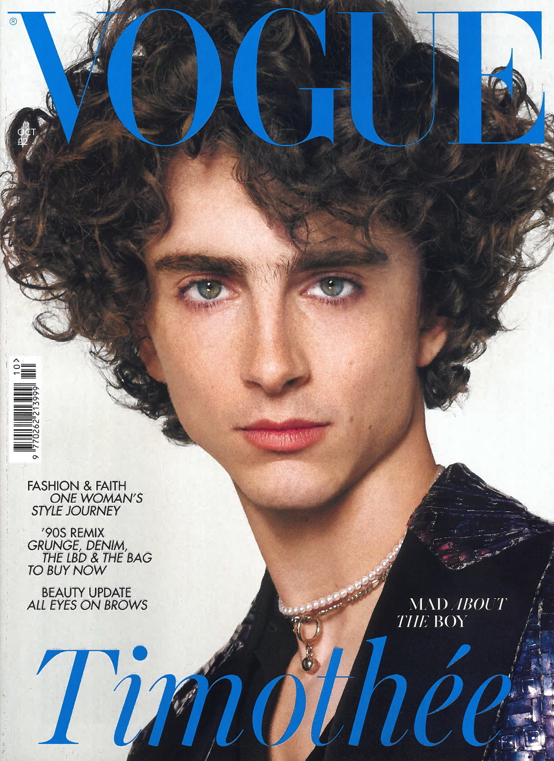 Timothée Chalamet Is BritishVogue’s First Solo Male Cover Star. For the first time in BritishVogue’s 106-year history, this month a man is flying solo on our cover. Editor-In-Chief Edward Enninful says "[...] Forever conscious of BritishVoguebeing a space that celebrates women first, I didn’t want a solo man on the cover to be a stunt or a statement. I wanted it to feel effortless, and then one day, it did. With a style so innate and self-assured that it inspires women and men alike, he was the perfect fit."